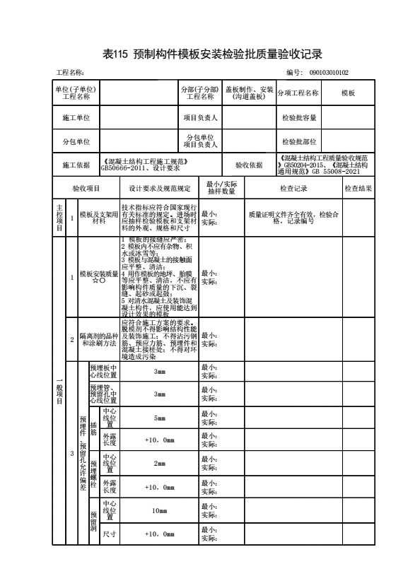 表格名称:090103010102 预制构件模板安装检验批质量验收记录