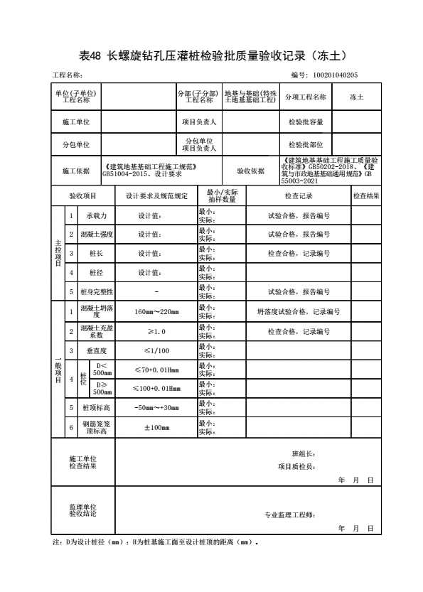 表格名称:100201040205 长螺旋钻孔压灌桩检验批质量验收记录(冻土)