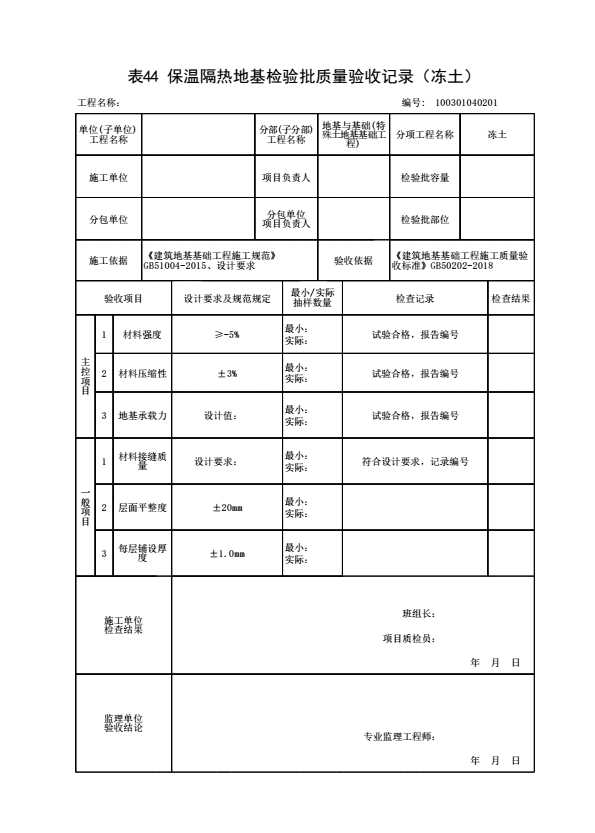 表格名称:100301040201 保温隔热地基检验批质量验收记录(冻土)