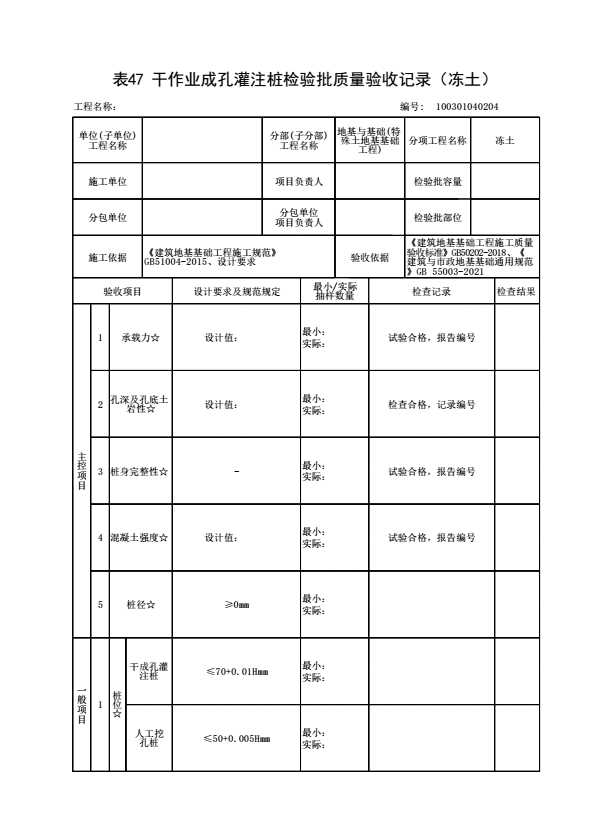 表格名称:100301040204 干作业成孔灌注桩检验批质量验收记录(冻土)
