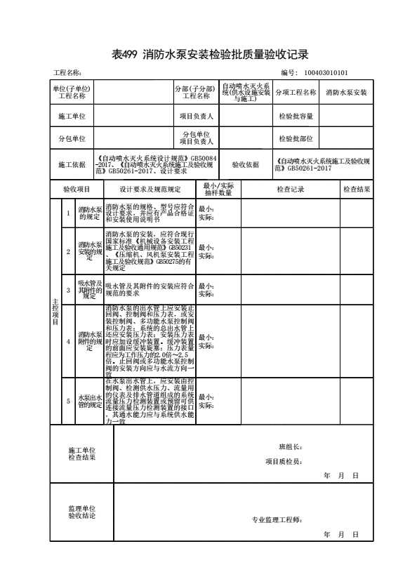 表格名称:100403010101 消防水泵安装检验批质量验收记录