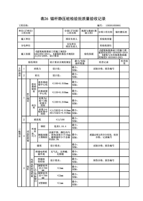 表格名称:130301050801 锚杆静压桩检验批质量验收记录