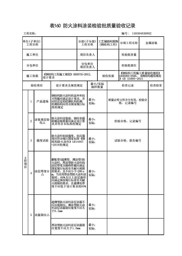 表格名称:130304030802 防火涂料涂装检验批质量验收记录