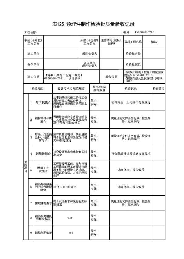 表格名称:150302010210 预埋件制作检验批质量验收记录