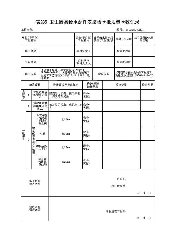 表格名称:150305030201 卫生器具给水配件安装检验批质量验收记录