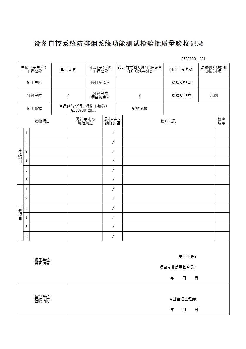 表格名称:06200301_设备自控系统防排烟系统功能测试检验批质量验收记录