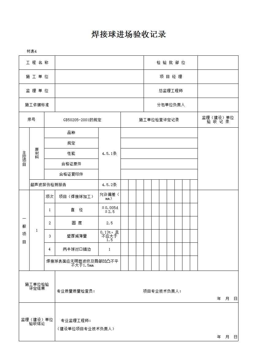 表格名称:焊接球进场验收记录