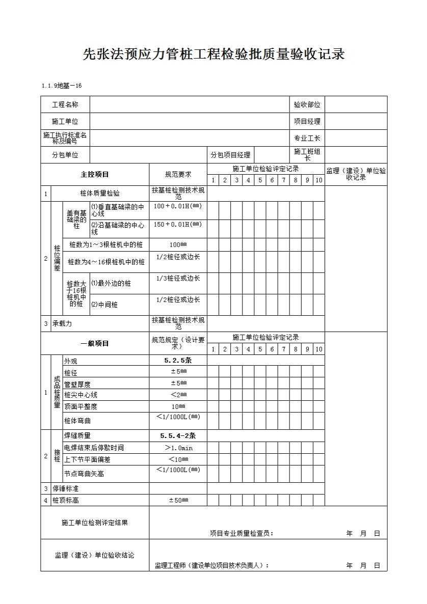 表格名称:先张法预应力管桩工程检验批质量验收记录010402