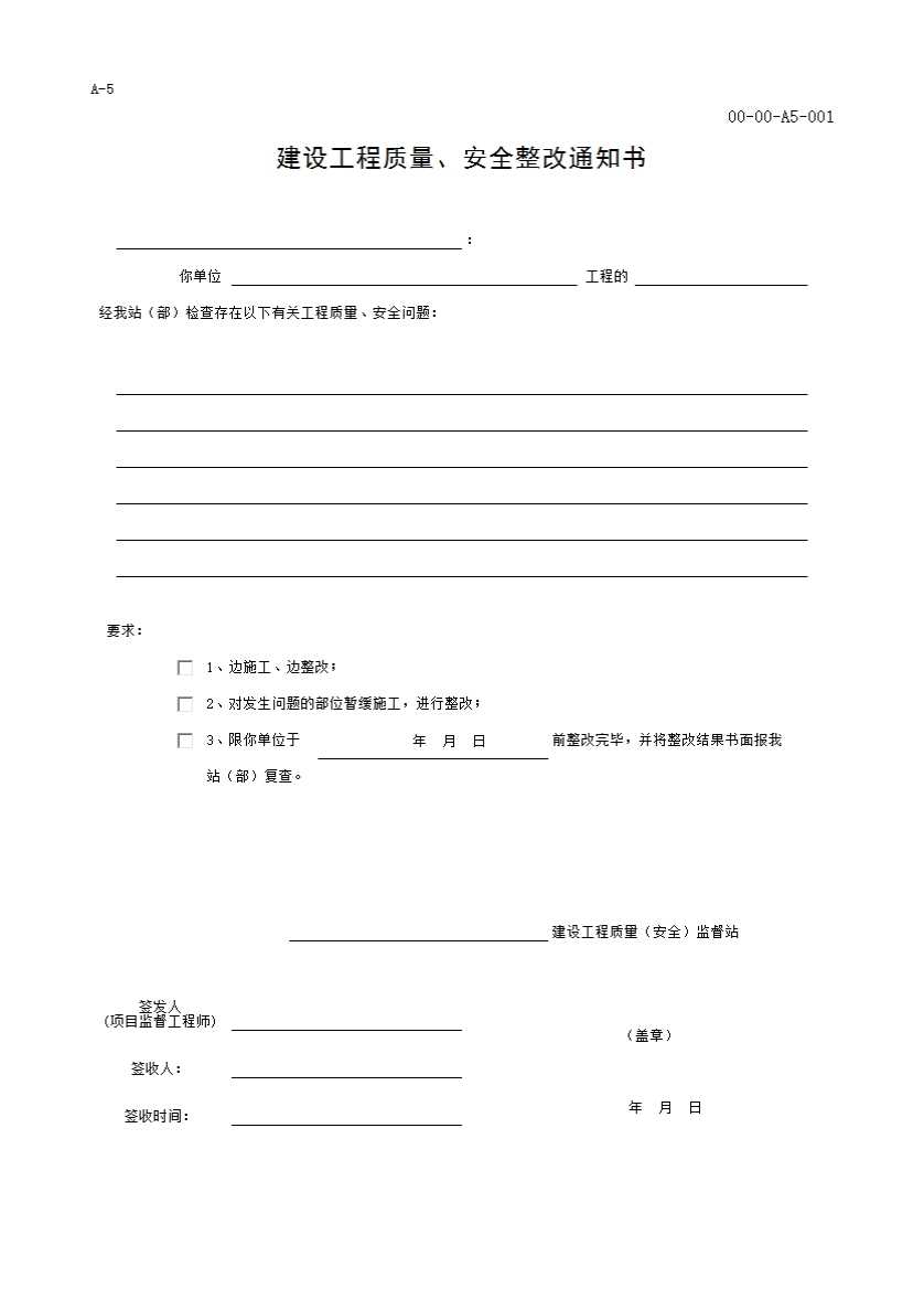表格名称:A-5 建设工程质量、安全整改通知书