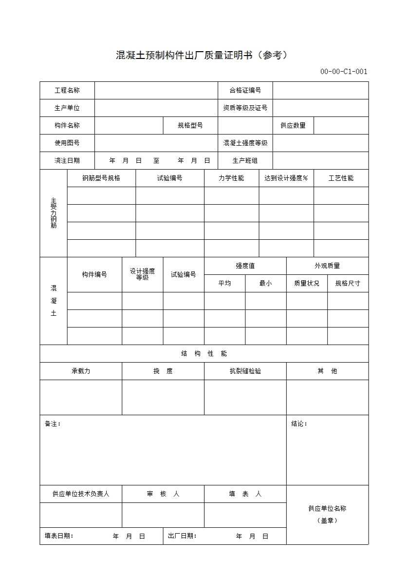 表格名称:混凝土预制构件出厂质量证明书(参考)
