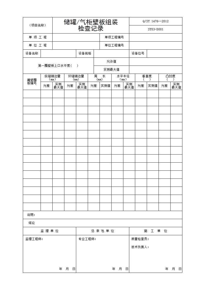 表格名称:SY03-D001 储罐/气柜壁板组装检查记录