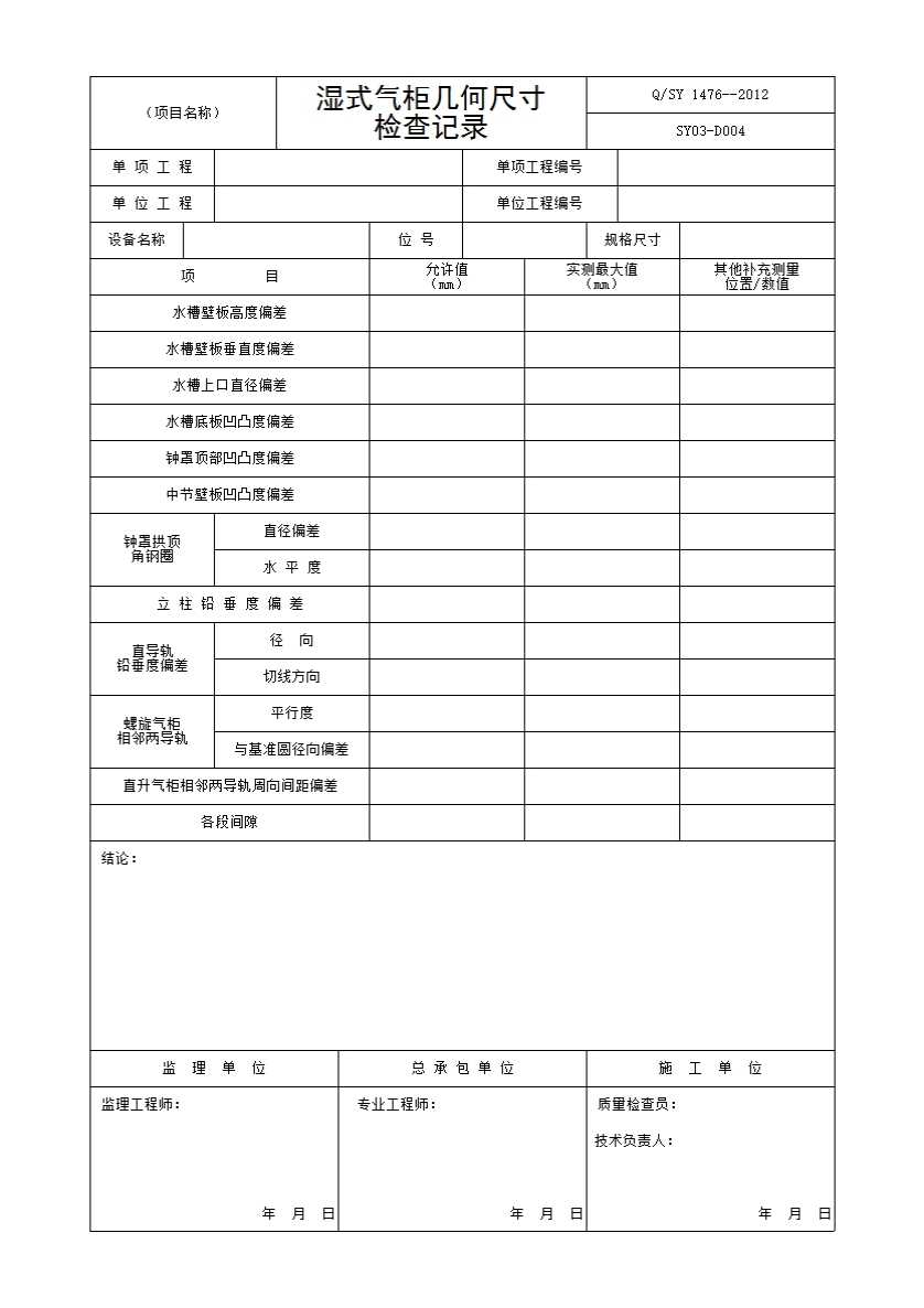 表格名称:SY03-D004 湿式气柜几何尺寸检查记录