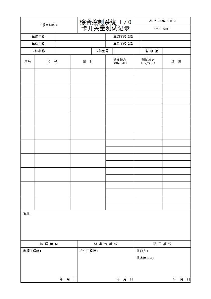 表格名称:SY03-G015 综合控制系统 I/0卡开关量测试记录