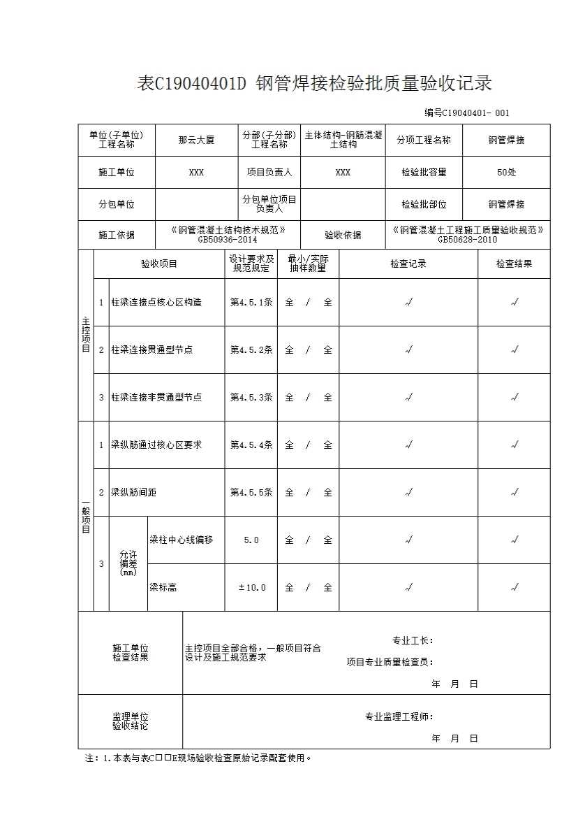 钢管混凝土柱与钢筋混凝土梁链接检验批质量验收记录表