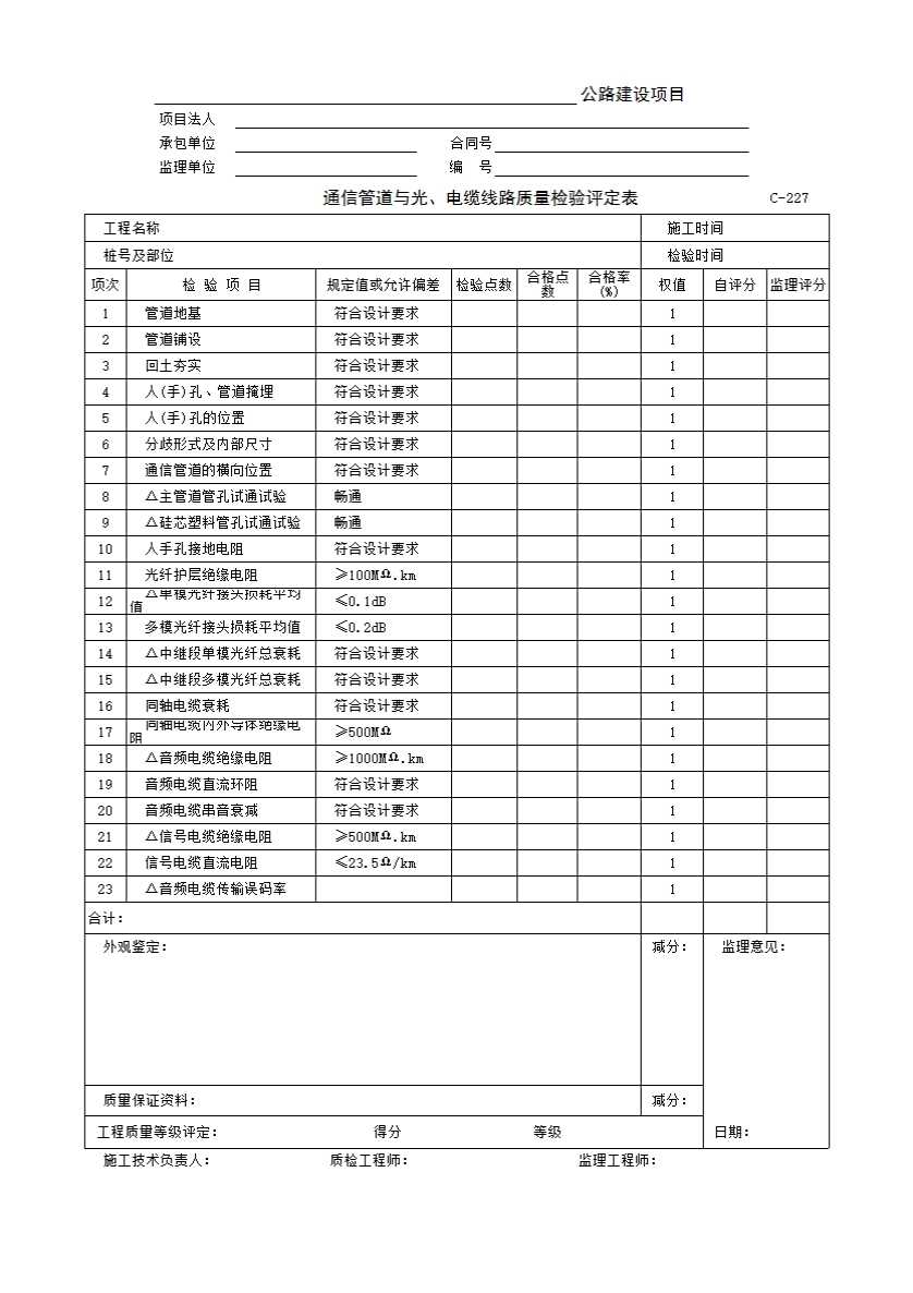 表格名称:C-227 通信管道与光、电缆线路质量检验评定表