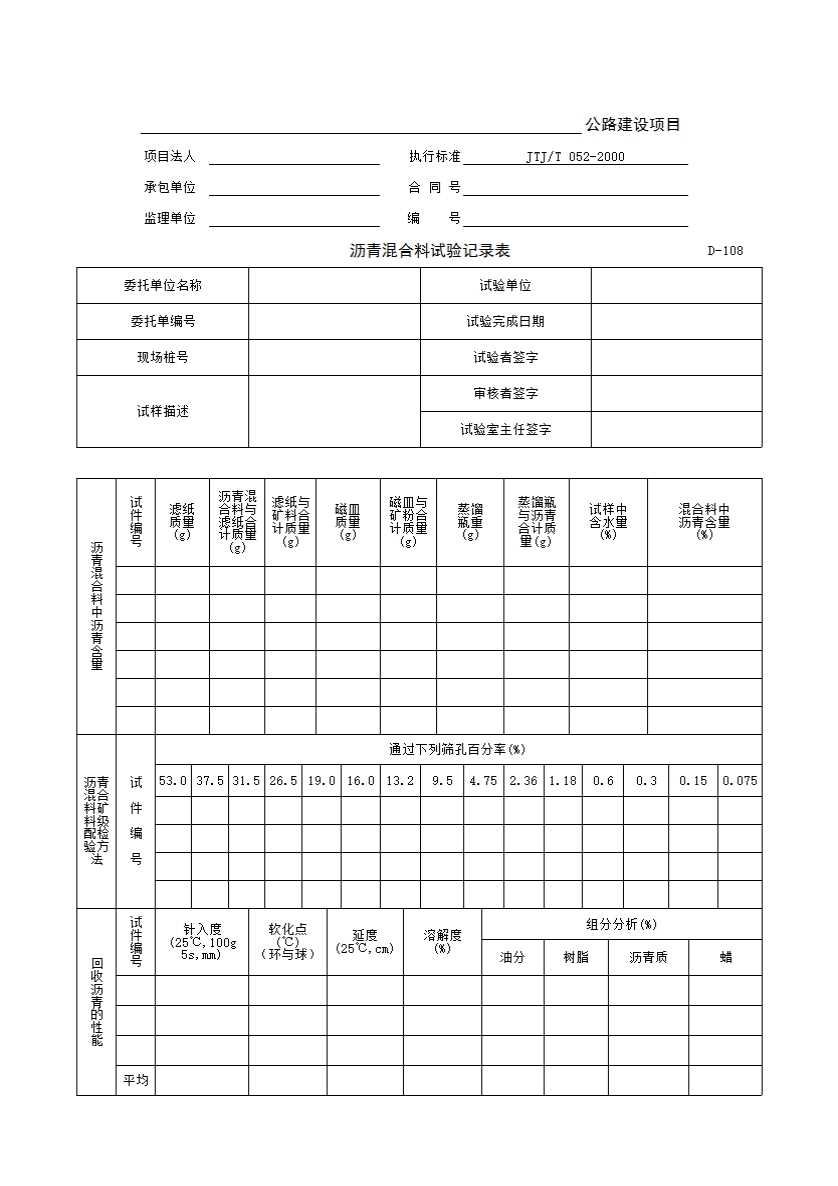表格名称:D-108 沥青混合料试验记录表