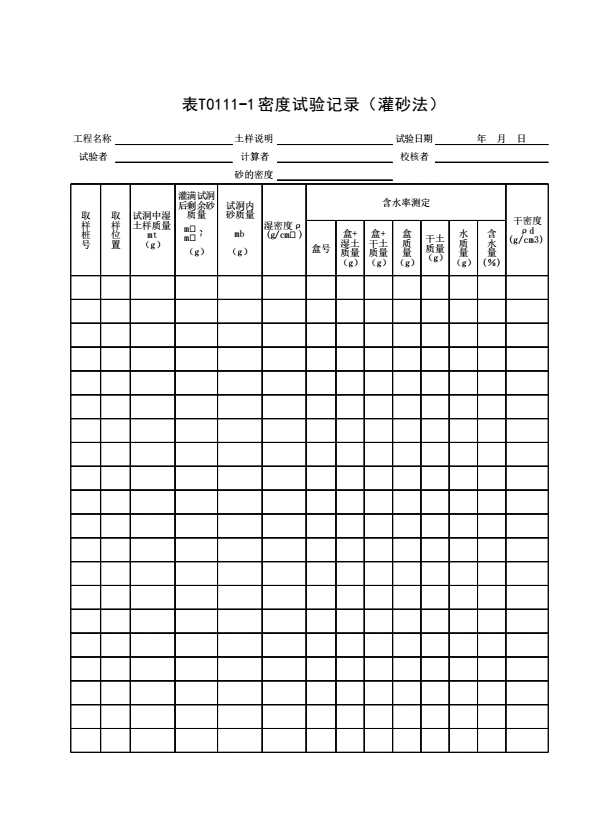 表格名称:表T0111-1 密度试验记录(灌砂法)