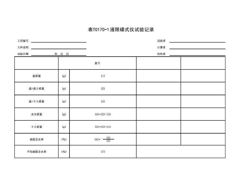表格名称:表T0170-1 液限碟式仪试验记录