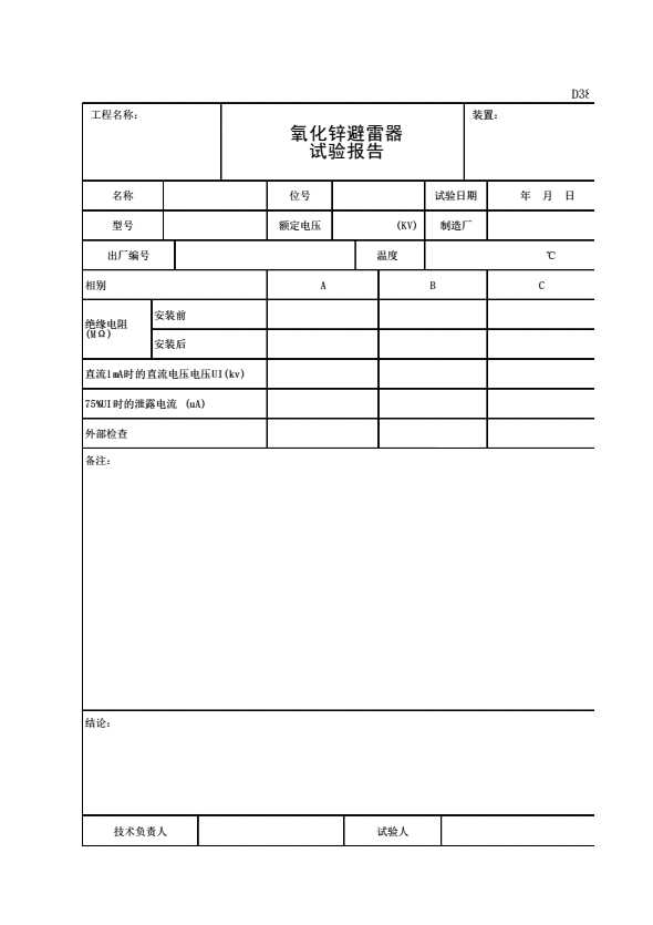 表格名称:D38 氧化锌避雷器试验记录