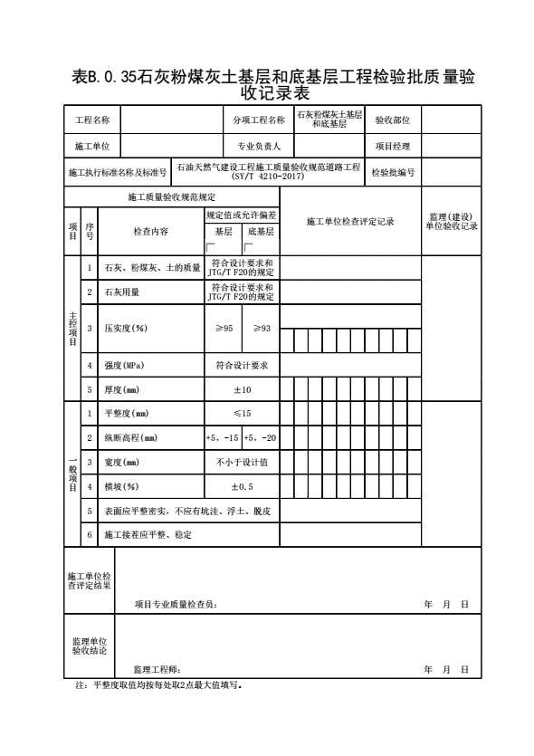 表格名称:表B.0.35 石灰粉煤灰土基层和底基层工程检验批质量验收记录表