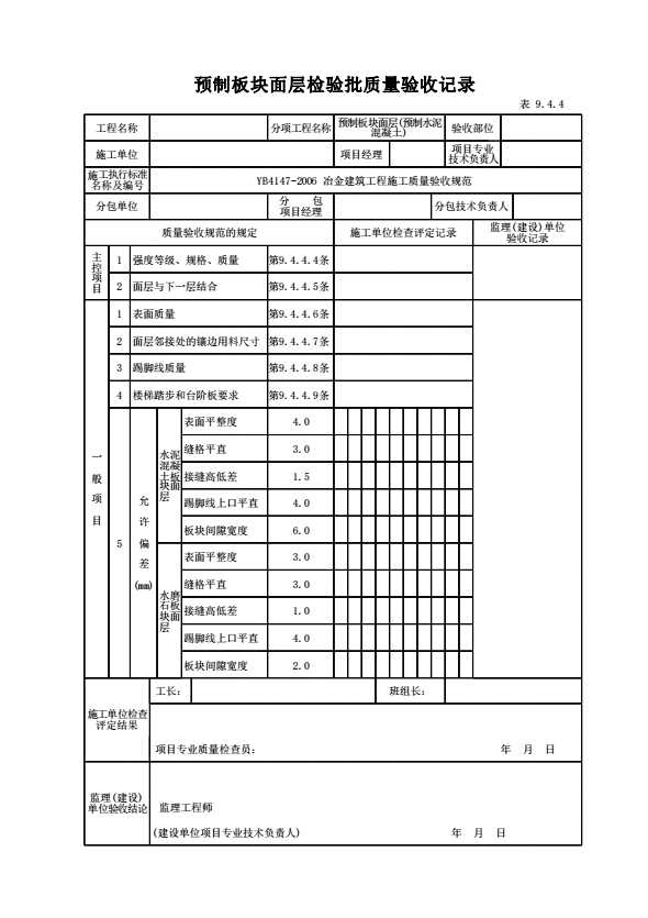 表格名称:表9.4.4 预制板块面层检验批质量验收记录