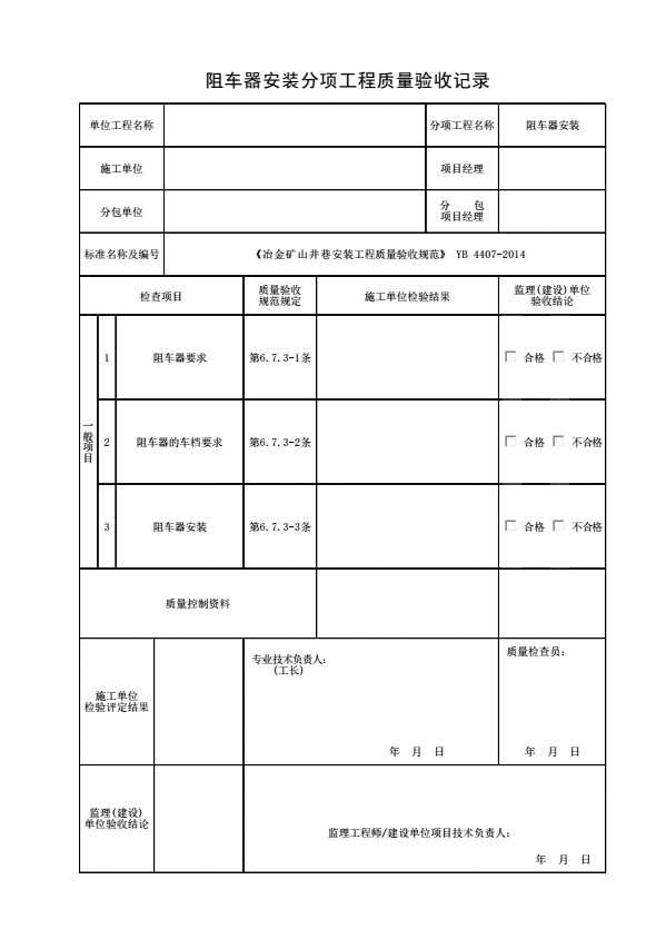 表格名称:阻车器安装分项工程质量验收记录