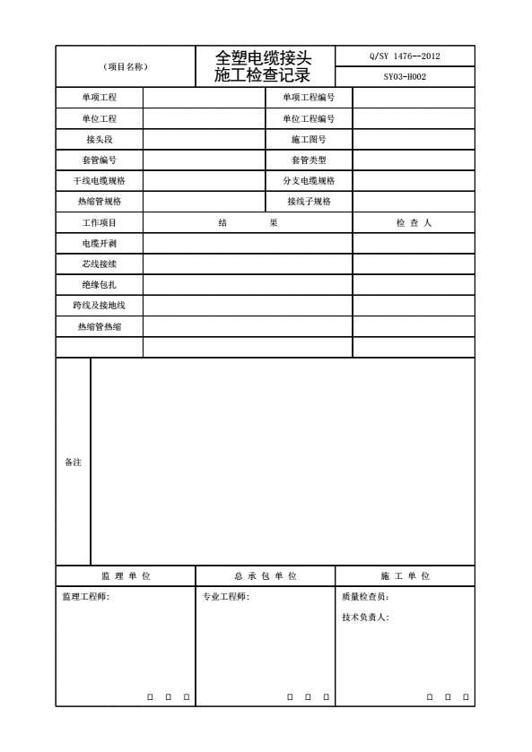 表格名称:SY03-H002 全塑电缆接头施工检查记录