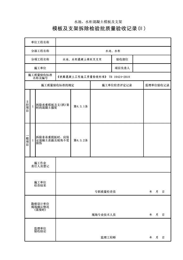 【水池、水柜混凝土模板及支架】模板及支架拆除检验批质量验收记录(Ⅱ)
