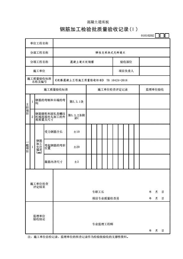 表格名称:01010202 【混凝土道床板】钢筋加工检验批质量验收记录(Ⅰ)