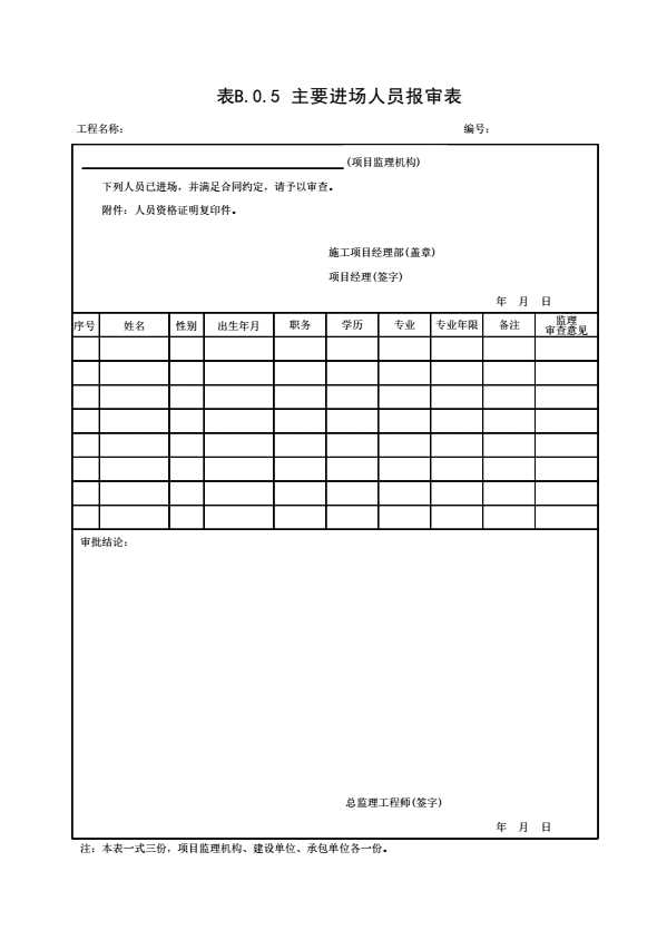表格名称:表B.0.5 主要进场人员报审表