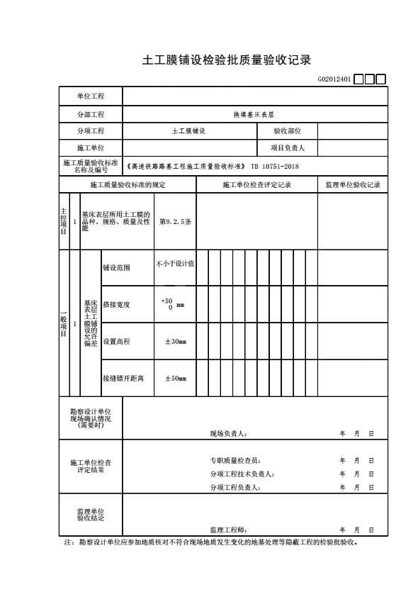表格名称:G02012401 土工膜铺设检验批质量验收记录