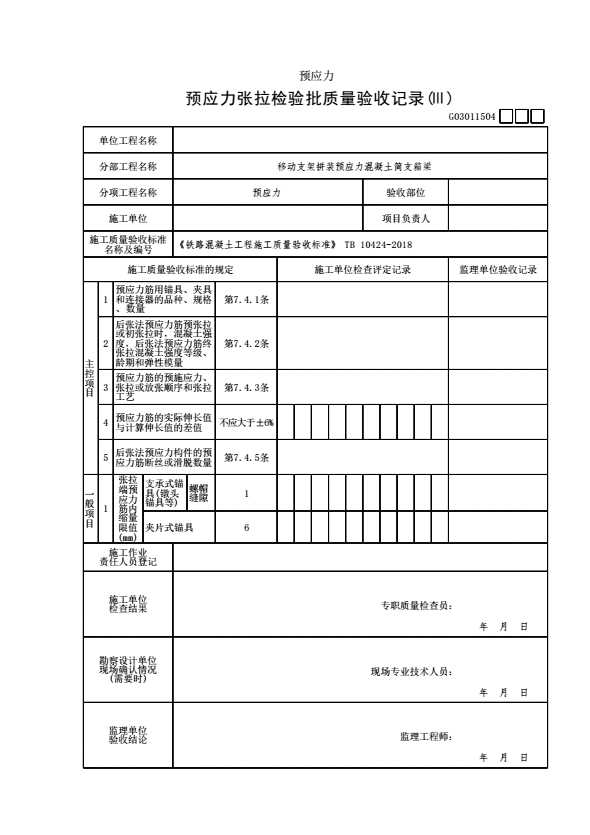 表格名称:G03011504 【预应力】预应力张拉检验批质量验收记录(Ⅲ)