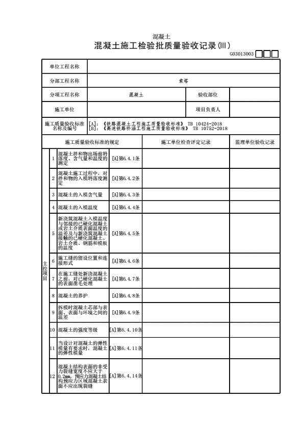 表格名称:G03013003 【混凝土】混凝土施工检验批质量验收记录(Ⅲ)