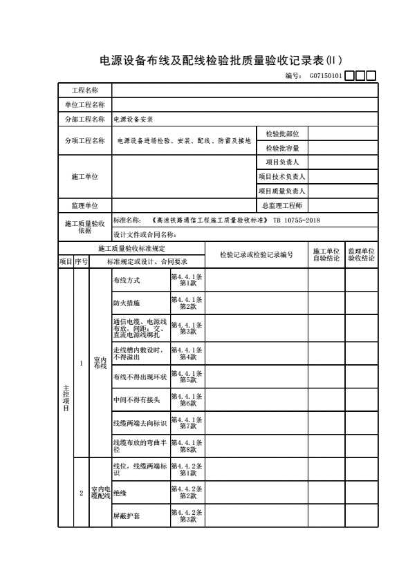 表格名称:G07150101 电源设备布线及配线检验批质量验收记录表(Ⅱ)