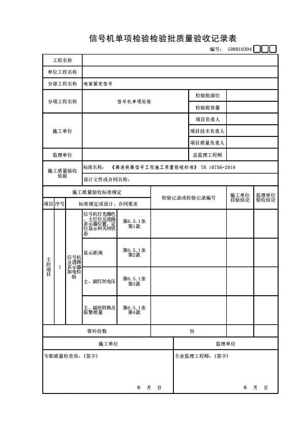 表格名称:G08010304 信号机单项检验检验批质量验收记录表