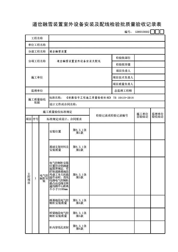 表格名称:G08010602 道岔融雪装置室外设备安装及配线检验批质量验收记录表