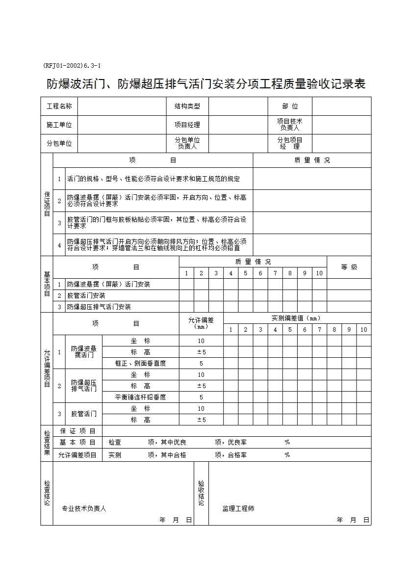 防爆波活门、防爆超压排气活门安装分项工程质量验收记录表