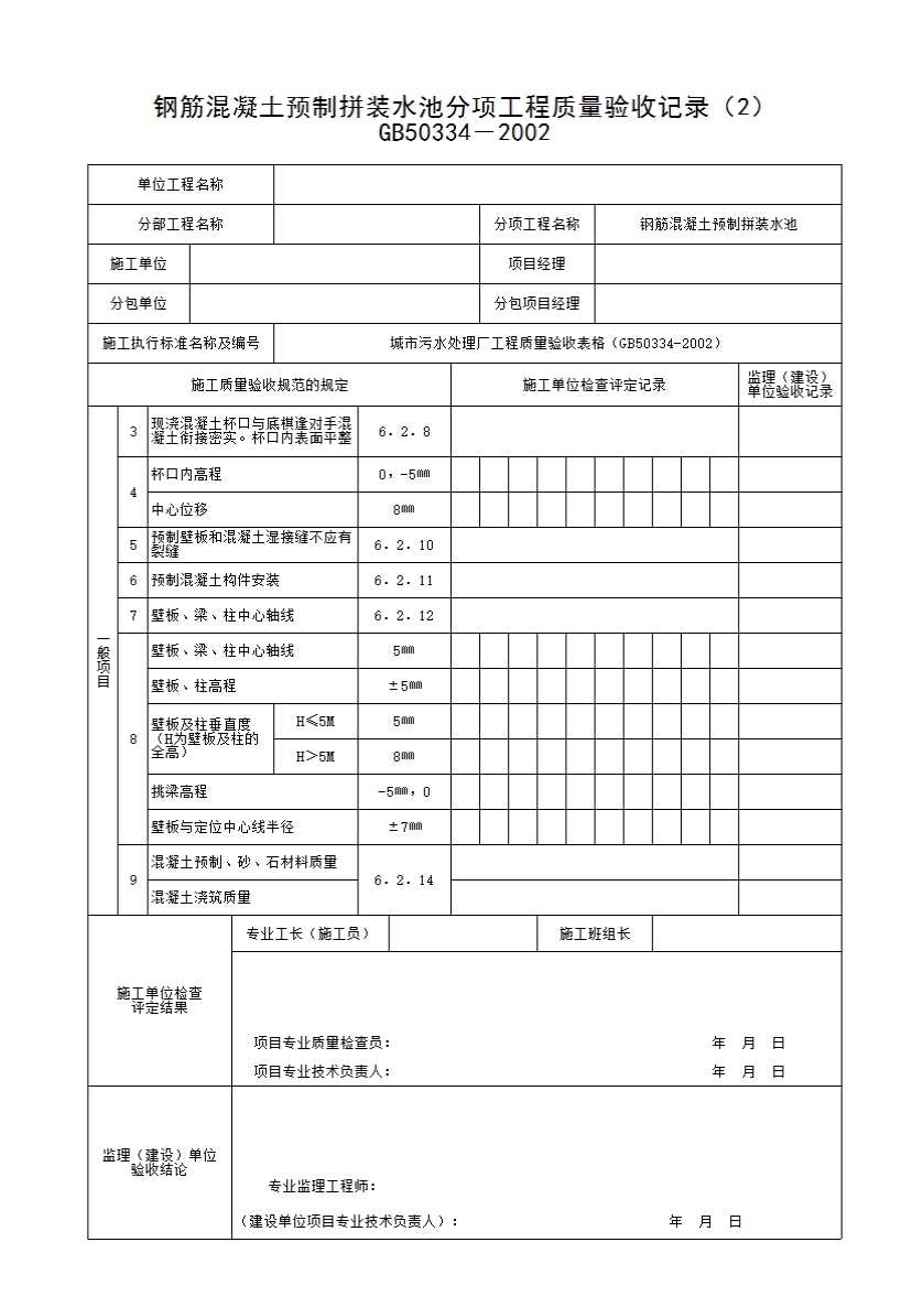 表格名称:20 钢筋混凝土预制拼装水池分项工程质量验收记录