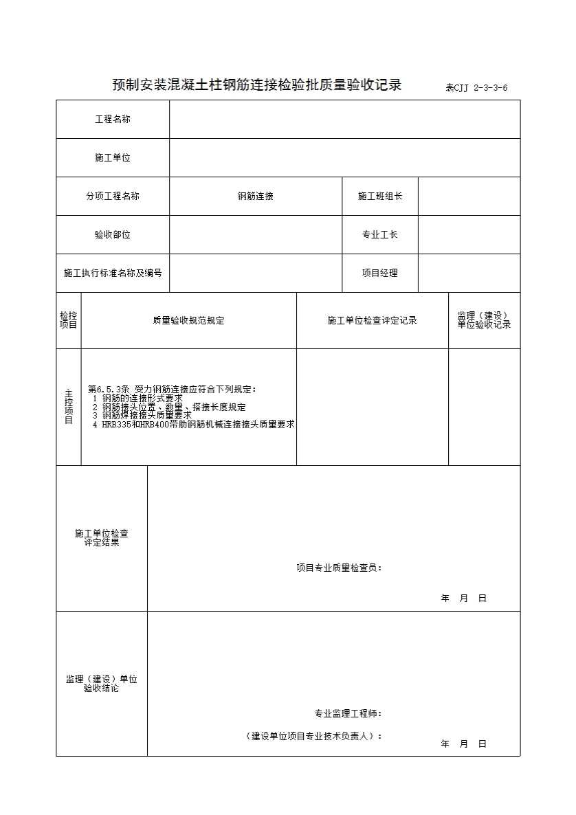 表格名称:表CJJ2-3-3-6 预制安装混凝土柱钢筋连接检验批质量验收记录