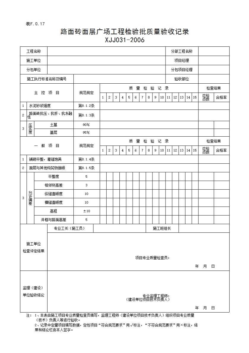 表格名称:表F.0.17路面砖面层广场工程检验批质量验收记录