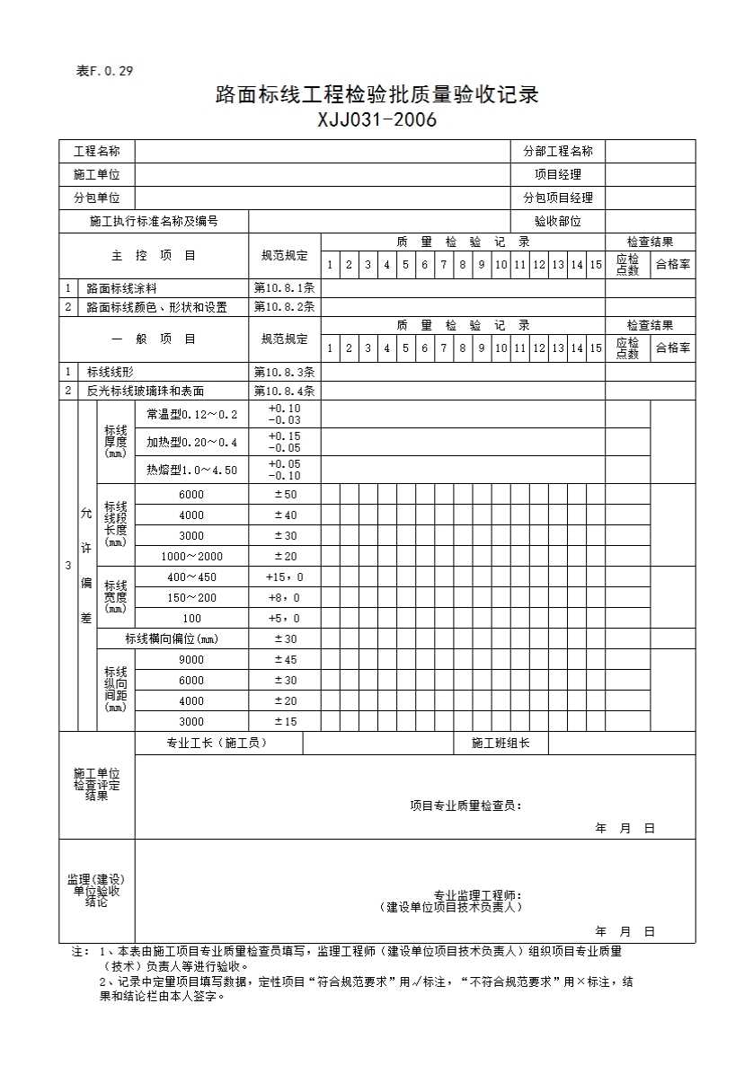 表格名称:表F.0.29路面标线工程检验批质量验收记录