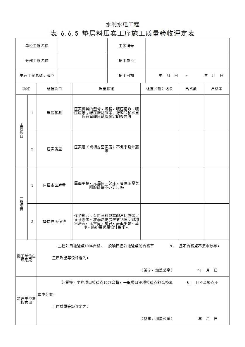 表 6.6.5 垫层料压实工序施工质量验收评定表