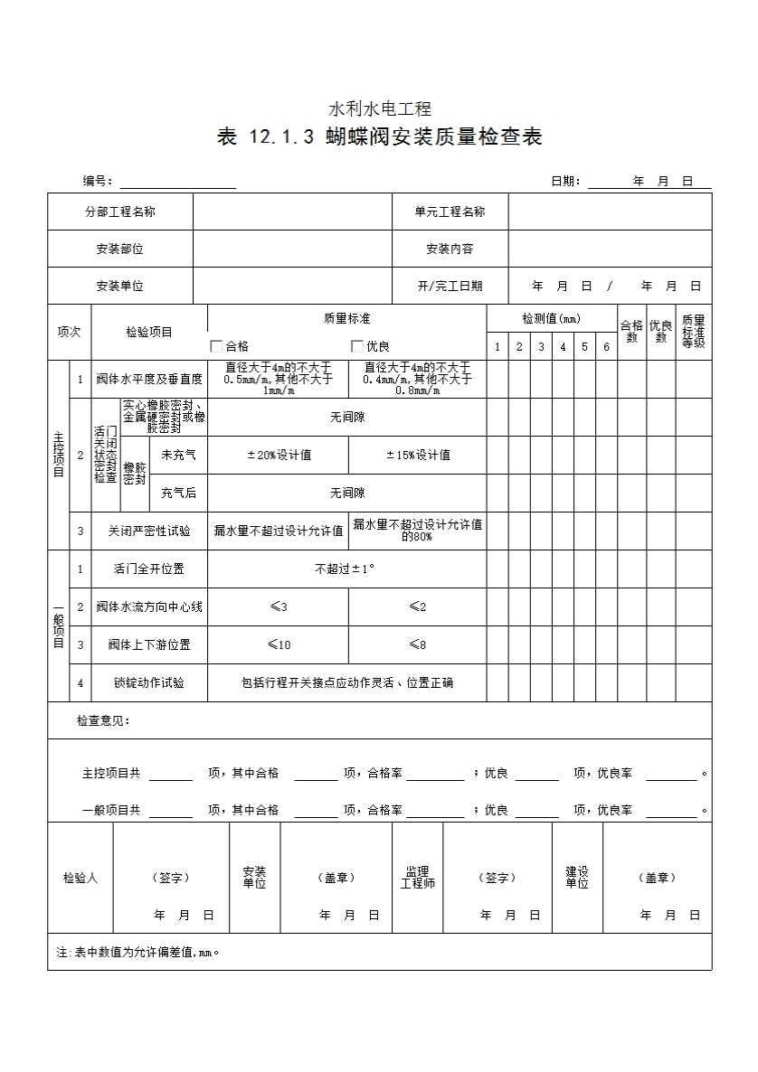 表格名称:表 12.1.3 蝴蝶阀安装质量检查表