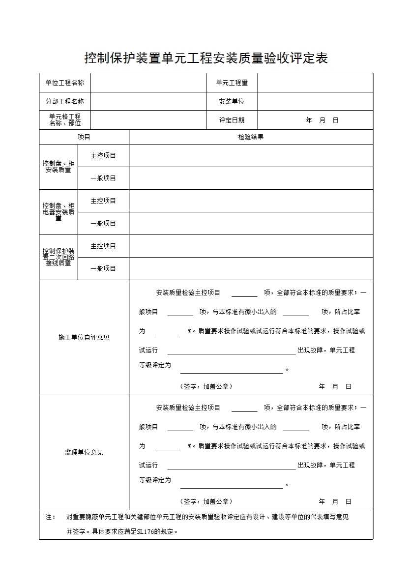 表格名称:控制保护装置单元工程安装质量验收评定表