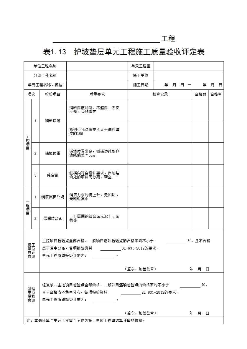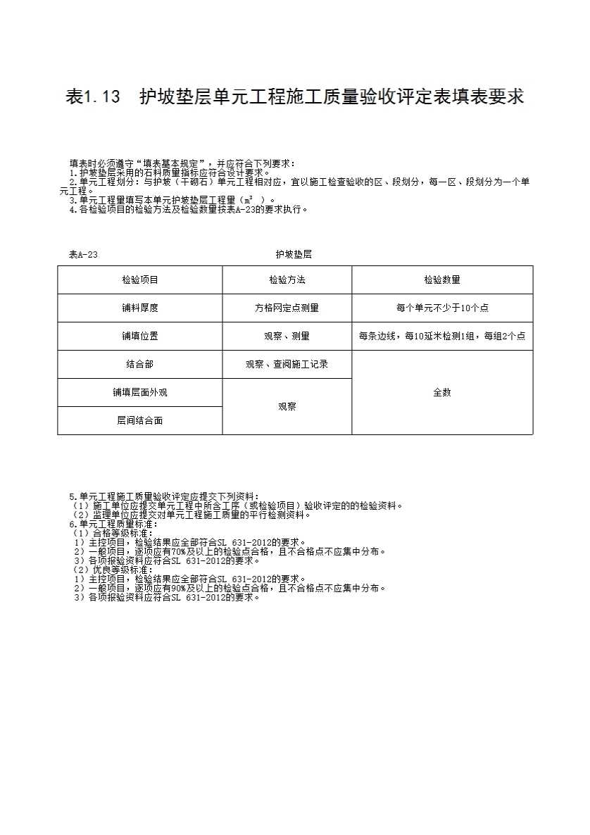 表1.13 护坡垫层单元工程施工质量验收评定表填表要求