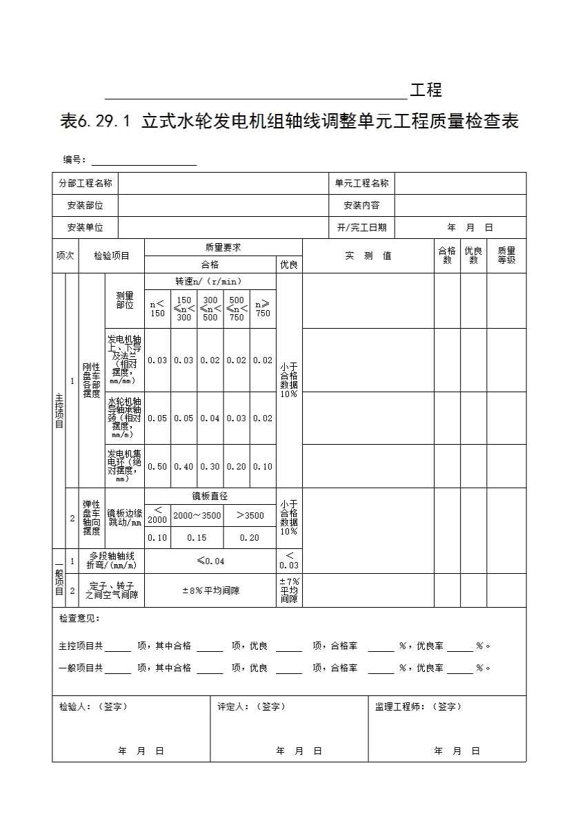 表格名称:表6.29.1 立式水轮发电机组轴线调整单元工程质量检查表