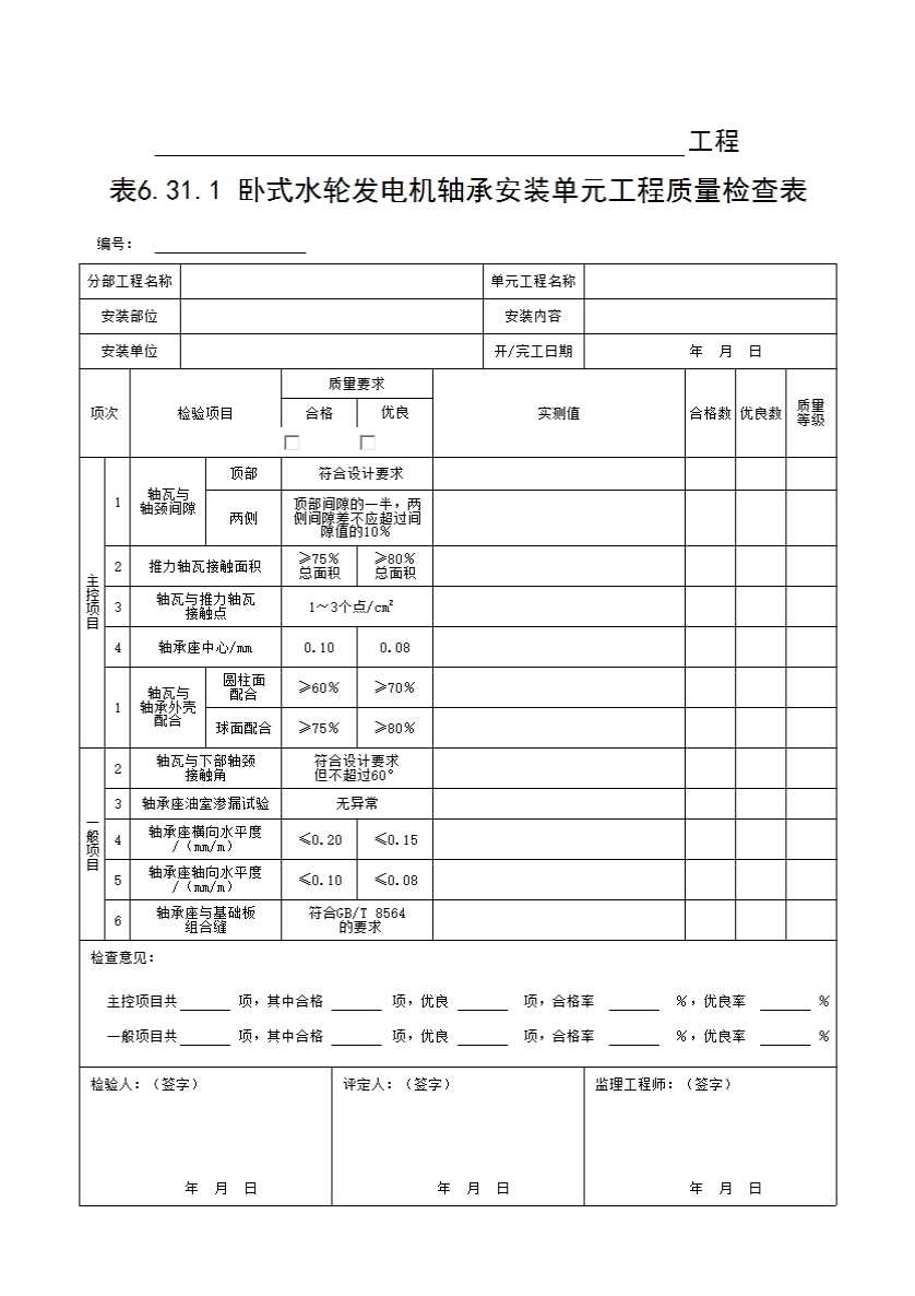 表格名称:表6.31.1 卧式水轮发电机轴承安装单元工程质量检查表