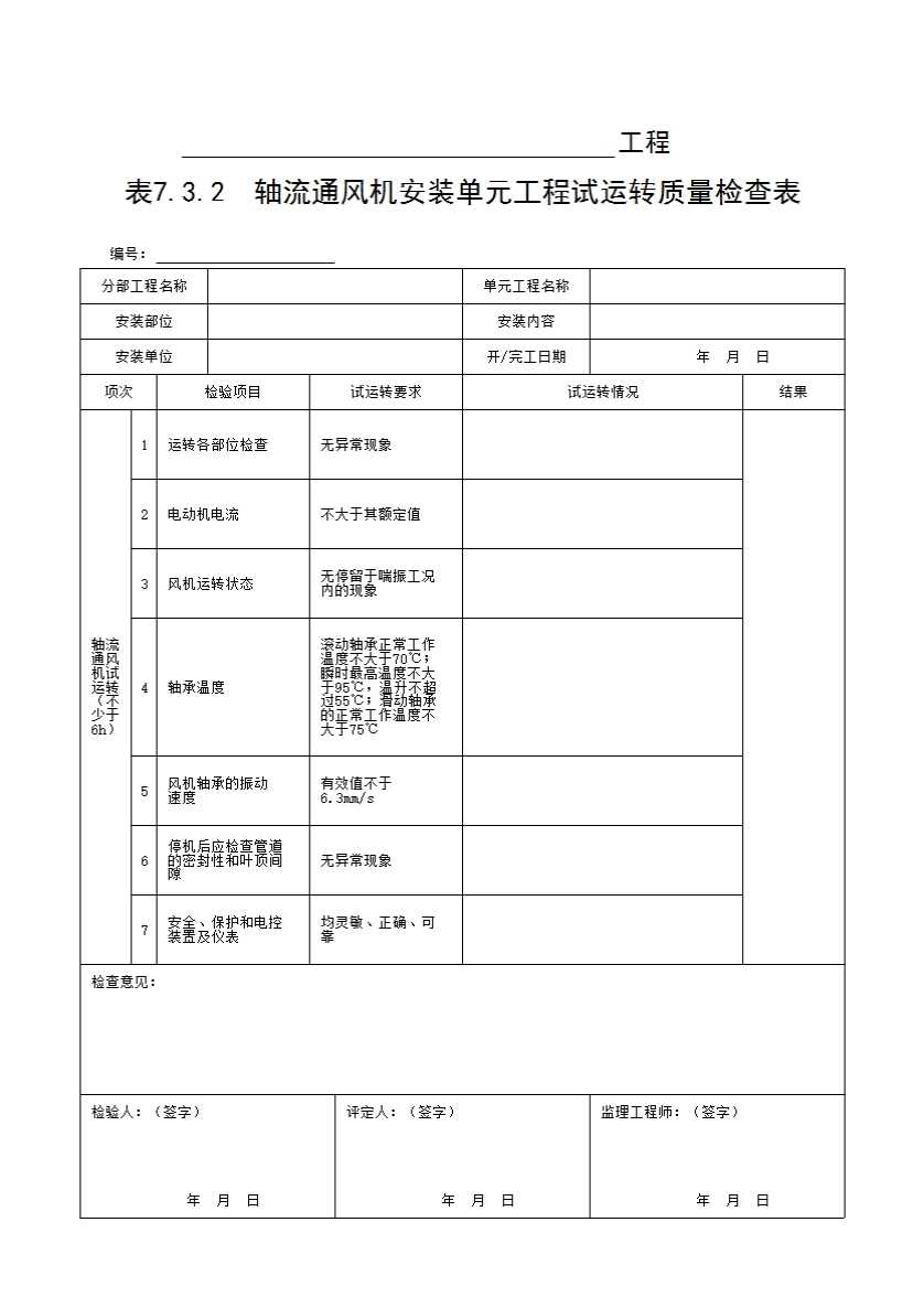 表格名称:表7.3.2 轴流通风机安装单元工程试运转质量检查表