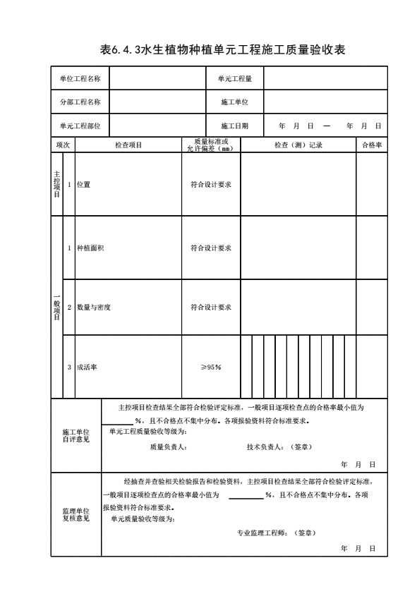 表6.4.3 水生植物种植单元工程施工质量验收表