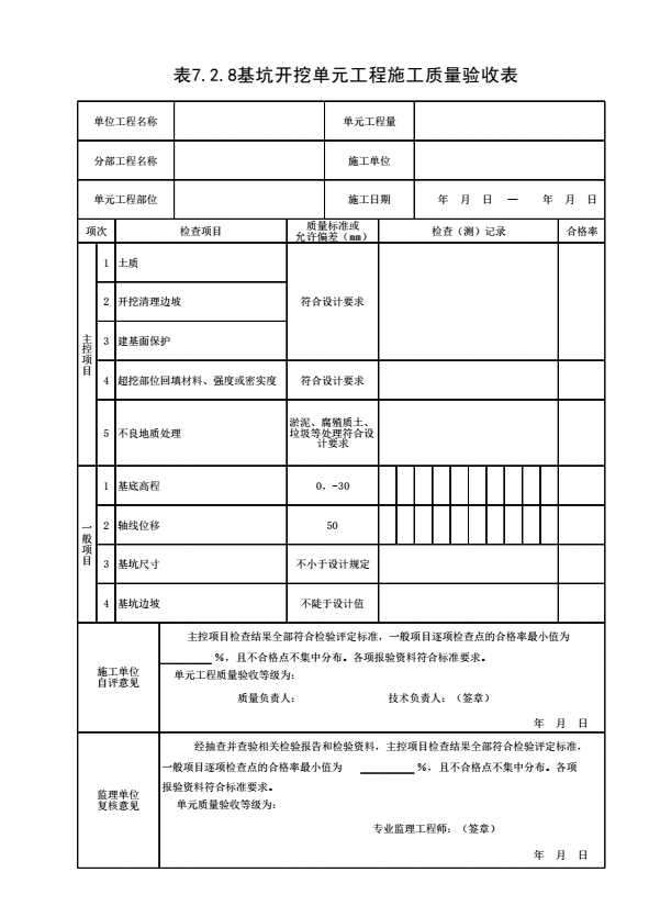 表7.2.8 基坑开挖单元工程施工质量验收表